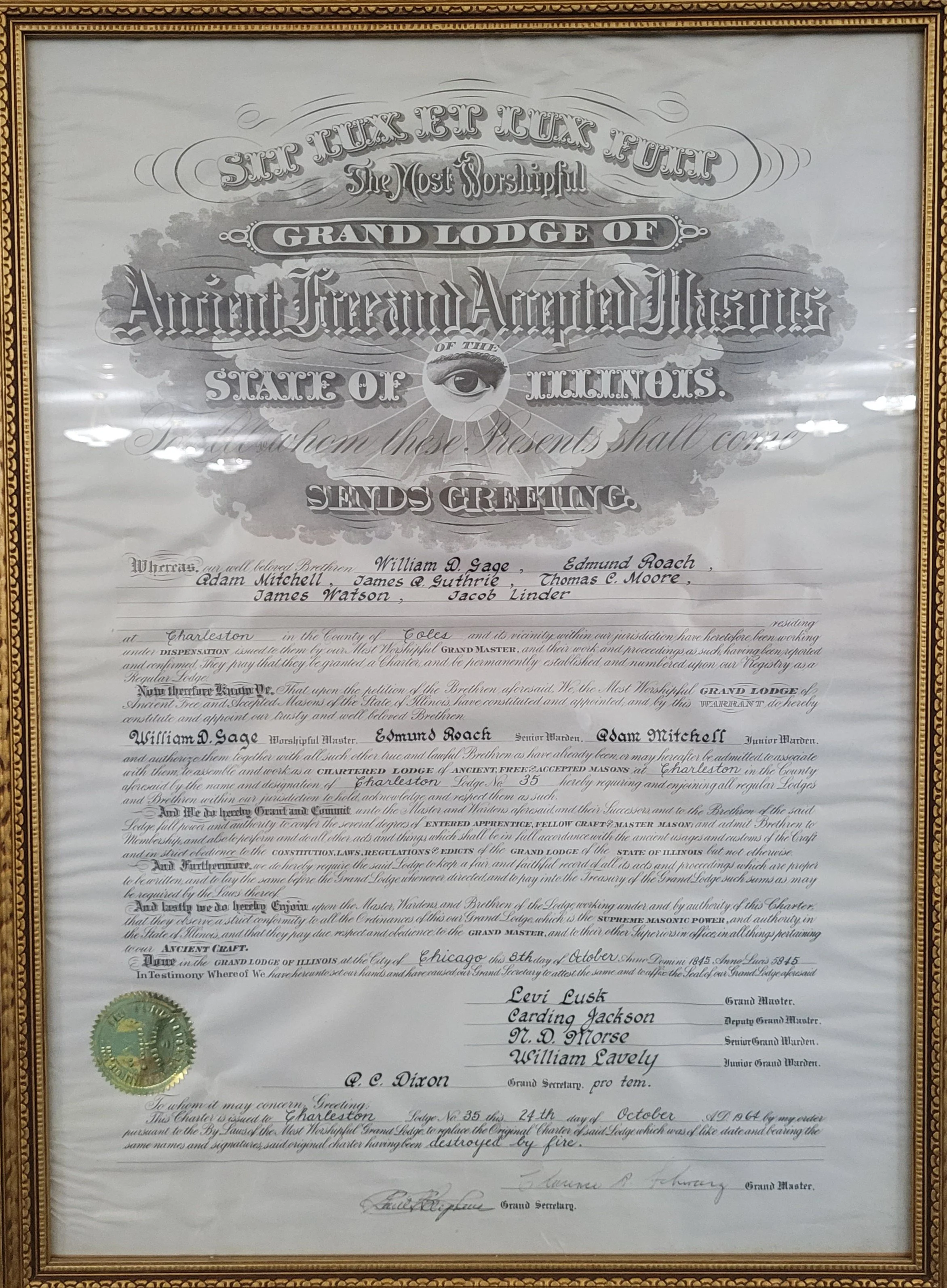 On October 6, 1845, Most Worshipful Grand Master Levi Lusk would report to the Grand Lodge of Illinois that he had granted dispensation to a Lodge in Charleston under the name Morning Star. Two days later, the Committee on Returns and Work of Lodges Under Dispensation reported in favor of granting a Charter to the Lodge in Charleston given that they change their name to Charleston Lodge #35 as Lodge #30 in Canton already bore the Morning Star name, and having a prior number had first rights to the name.